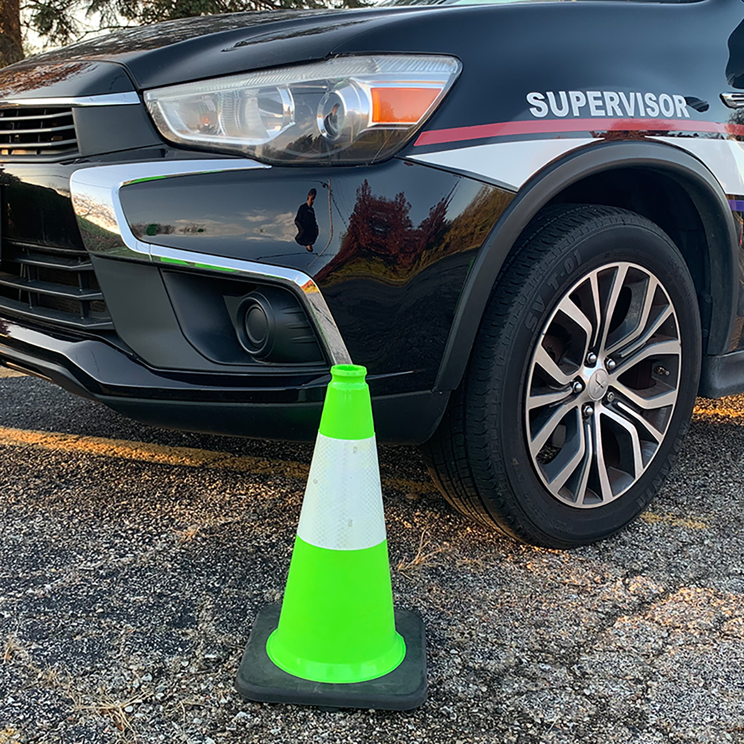 Durable 18" lime green construction cones with Type IV HIP retroreflective collar that provides high visibility. PVC injection molding process ensures they will be flexible to withstand vehicle impact and still maintain their shape. One-piece design keeps the bases from being lost or removed accidentally. Bases are made of flexible rubber to help them grip the road and remain stable in higher winds. Cones are stackable for storage and are great for directing traffic, marking construction sites, and managing parking lot traffic.