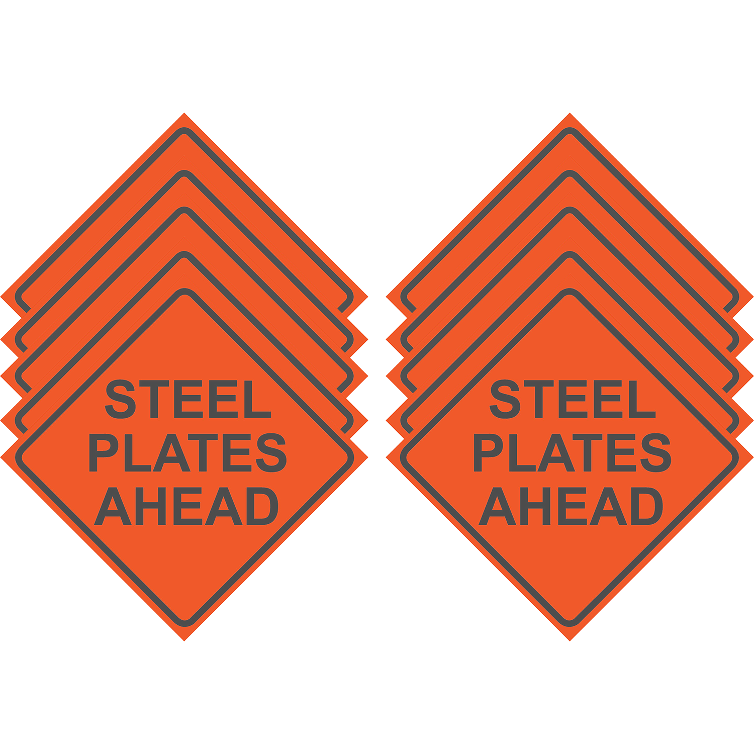 24" x 24" reflective water-resistant polyboard “STEEL PLATES AHEAD” signs are perfect for temporary outdoor use. Weather-resistant, lightweight, and easy to display in construction, roadwork, and hazard zones. An inexpensive alternative to metal traffic construction signs for short-term use.