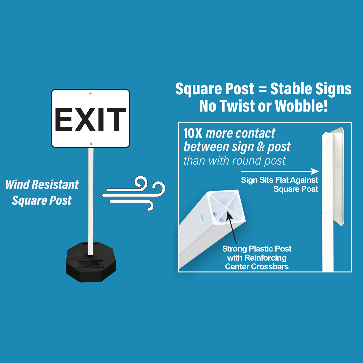 Signs attached to square plastic posts are more stable than when attached to round posts.
